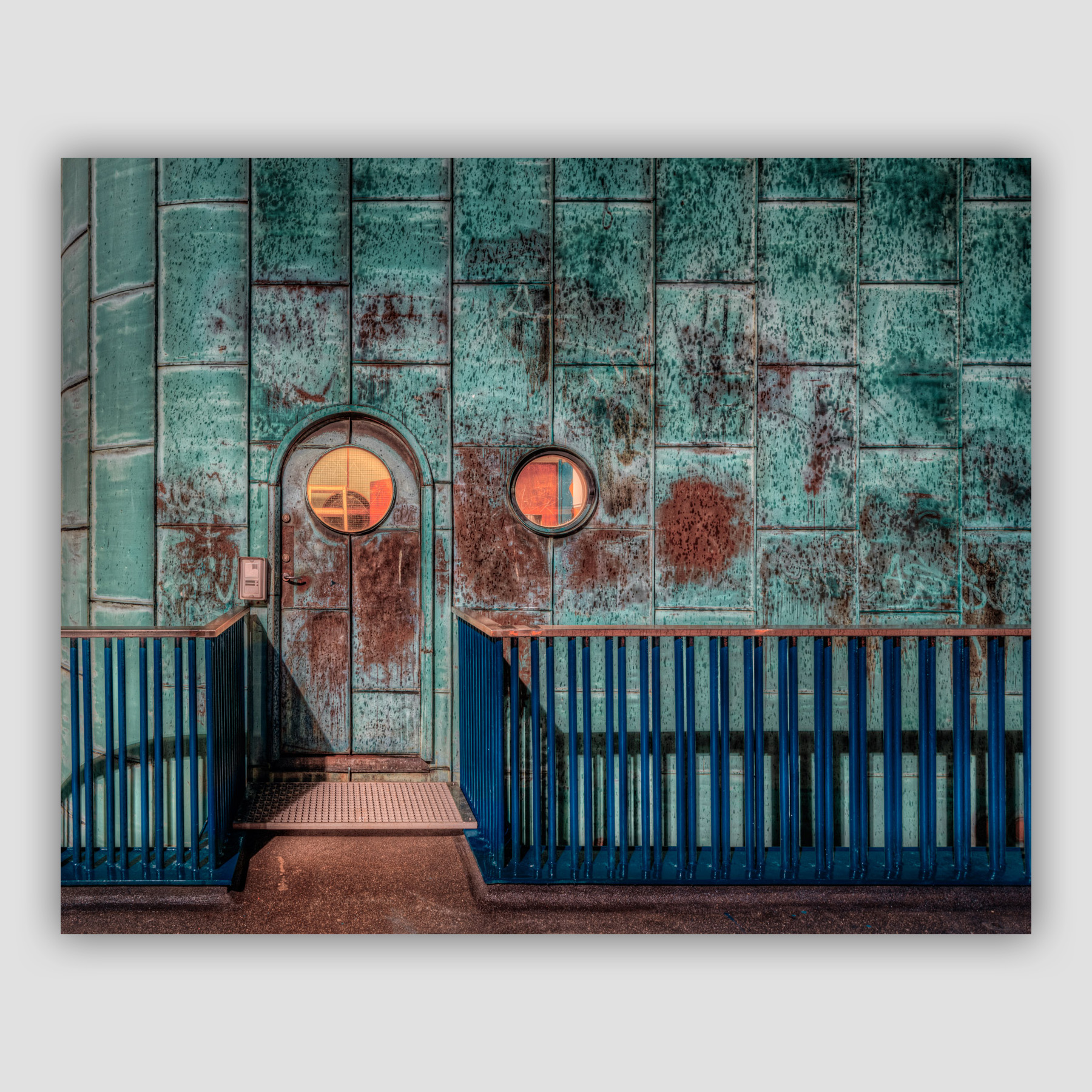 Motivet viser den patinerede kobberbeklædning og de karakteristiske runde vinduer, der giver bygningen et maritimt udtryk. Værket arbejder med farveharmonien mellem det irgrønne metal og det varme lys inde fra kontrolrummet.